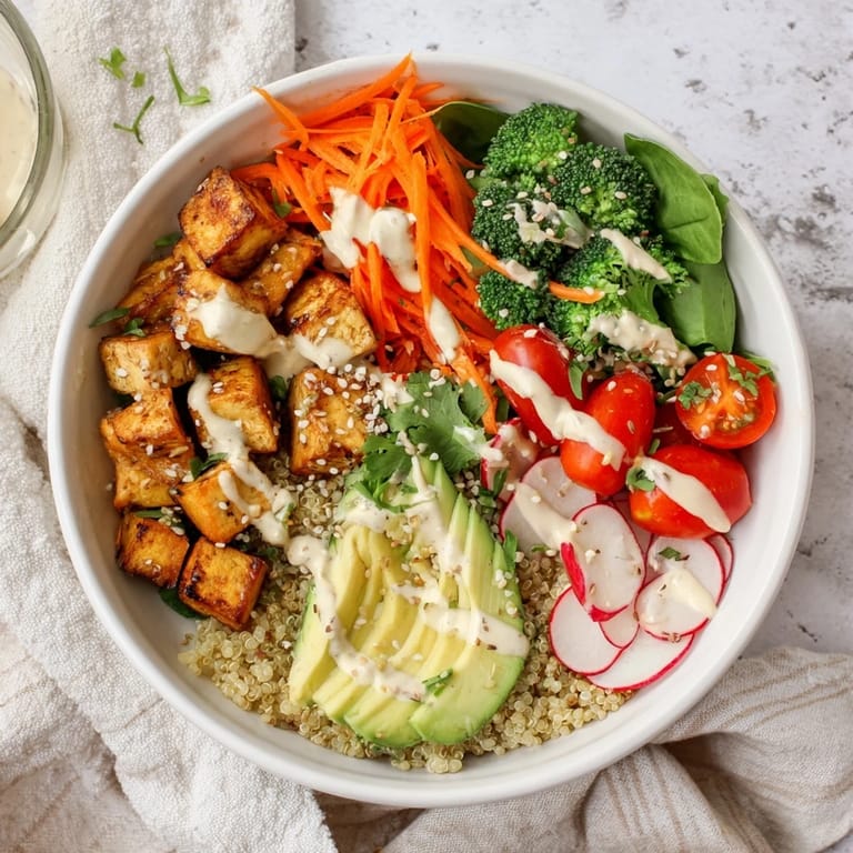 Press your tofu for at least 15 minutes to remove excess moisture, then cut into uniform cubes. Toss with minimal oil and seasoning, spread on a baking sheet without overcrowding, and bake at 200°C (400°F). Flip halfway through cooking for even browning. The result is golden, crispy cubes with a satisfying texture that contrasts beautifully with the creamy tahini dressing.