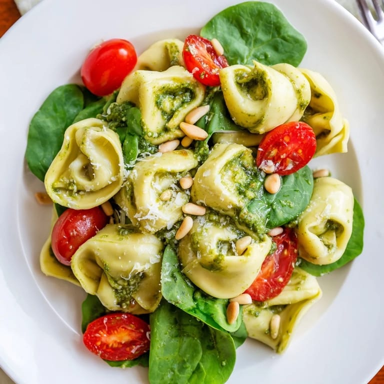 Save My neighbor showed up at my door one afternoon with a container of this salad, still cool from her fridge. She'd made too much for her book club and thought I might want some. One bite and I was texting her for the recipe before I'd even finished chewing. The pesto clung to every curve of those plump tortellini, and the tomatoes burst with sweetness against the peppery spinach. I've been making my own version ever since, tweaking it just slightly to match what I remember from that first generous taste.
