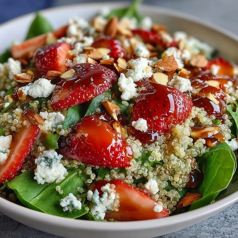 The secret is contrast—not just in flavors but in textures and temperatures. The warm earthiness of quinoa plays beautifully against the bright tartness of balsamic, while feta's creaminess melts slightly from the residual warmth of the grain. Spinach gives you something substantial to chew on, strawberries offer natural sweetness without any sugar you've added yourself, and almonds provide that final crunch that makes your brain register the dish as complete and satisfying. It's a salad that feels intentional because every ingredient has a job.